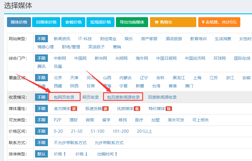 媒體收錄的影響因素有很多,平臺上的“收錄情況”只是一種參考,如果對媒體收錄有要求,可以在 “媒體價(jià)格” 頁面選擇 “包網(wǎng)頁收錄” 或者 “包百度新聞源收錄” ,進(jìn)行篩選。