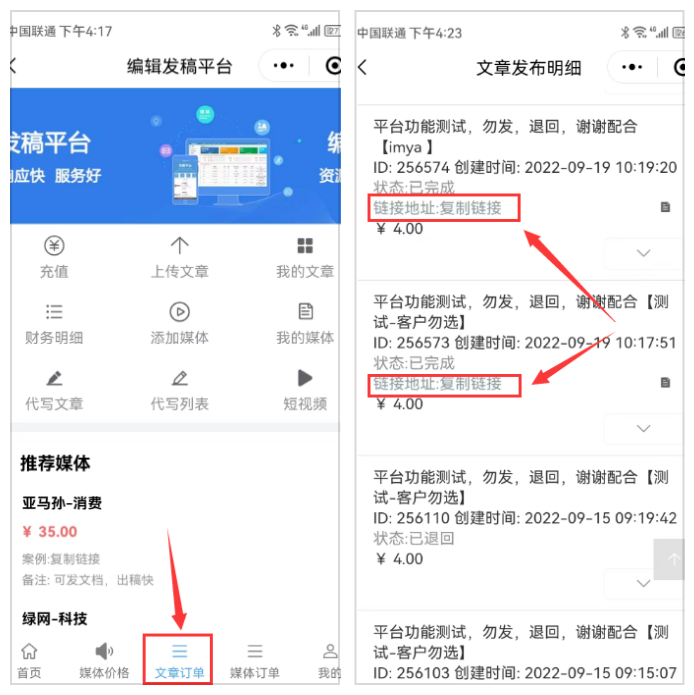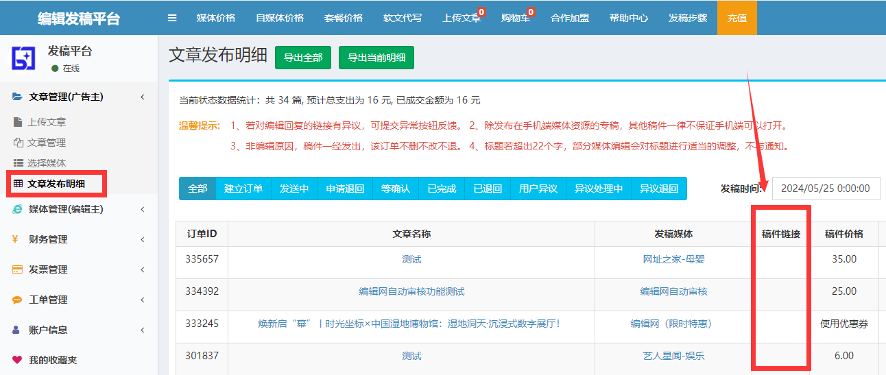 客戶下單成功后,會(huì)在【文章管理】-【文章發(fā)布明細(xì)】頁面生成訂單,編輯發(fā)布成功后,【稿件鏈接】里會(huì)顯示回復(fù)的鏈接(如下圖所示)。