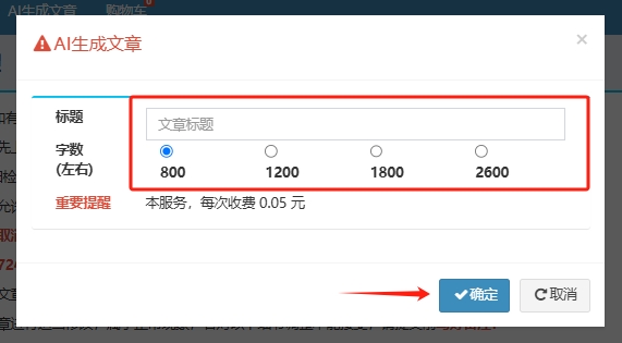 填好需要的標題,選好字數(shù)范圍,點擊【確定】,耐心等待文章生成。