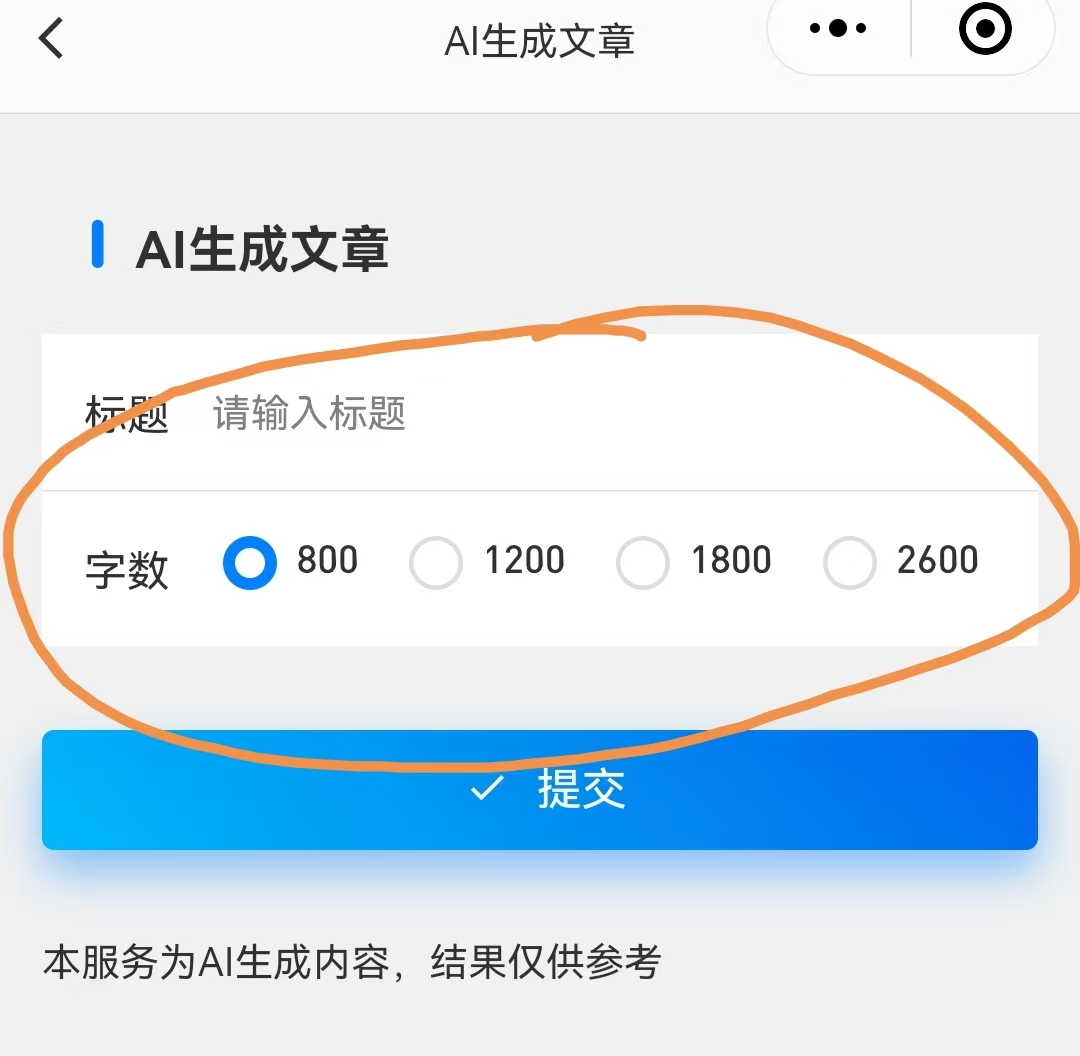 進入小程序首頁,點擊【AI生成文章】按鈕,輸入標題和字數(shù),提交即可。