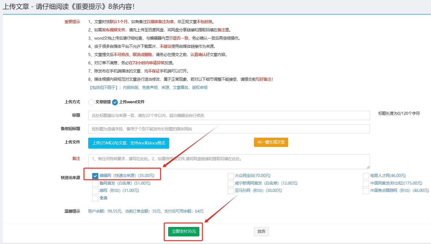 進入【上傳文章】頁面,傳好文章后,勾選【編輯網(wǎng)(快速出來源)】,立即支付即可!